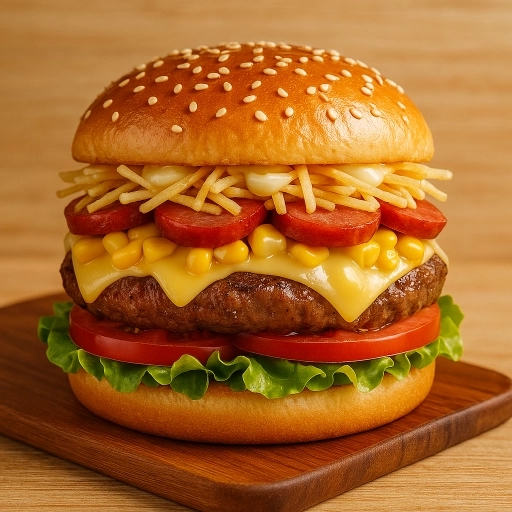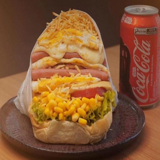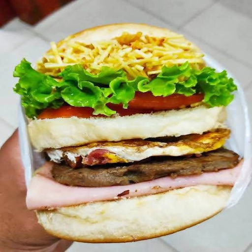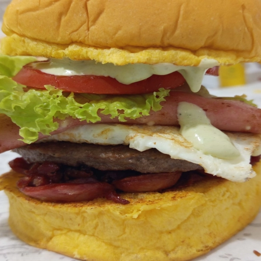 PĂŁo, 2 carne, bacon, calabresa, 2 ovos, 2 presuntos, 2 queijos, cheddar,salada, milho, batata palha.