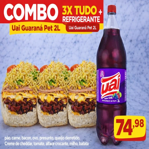 COMBO 3-X Tudo + Refrigerante uai guaranĂĄ Pet 2L. 74,98